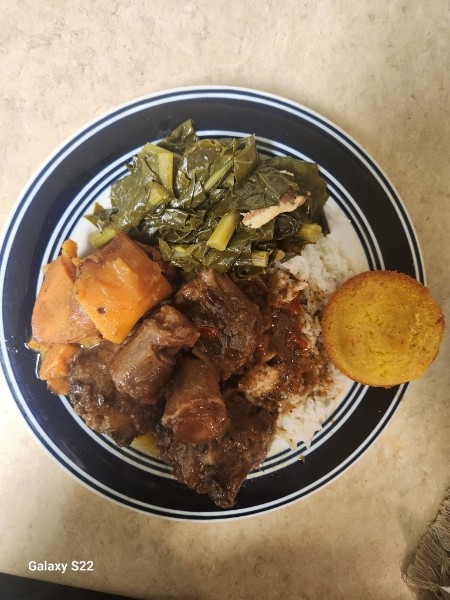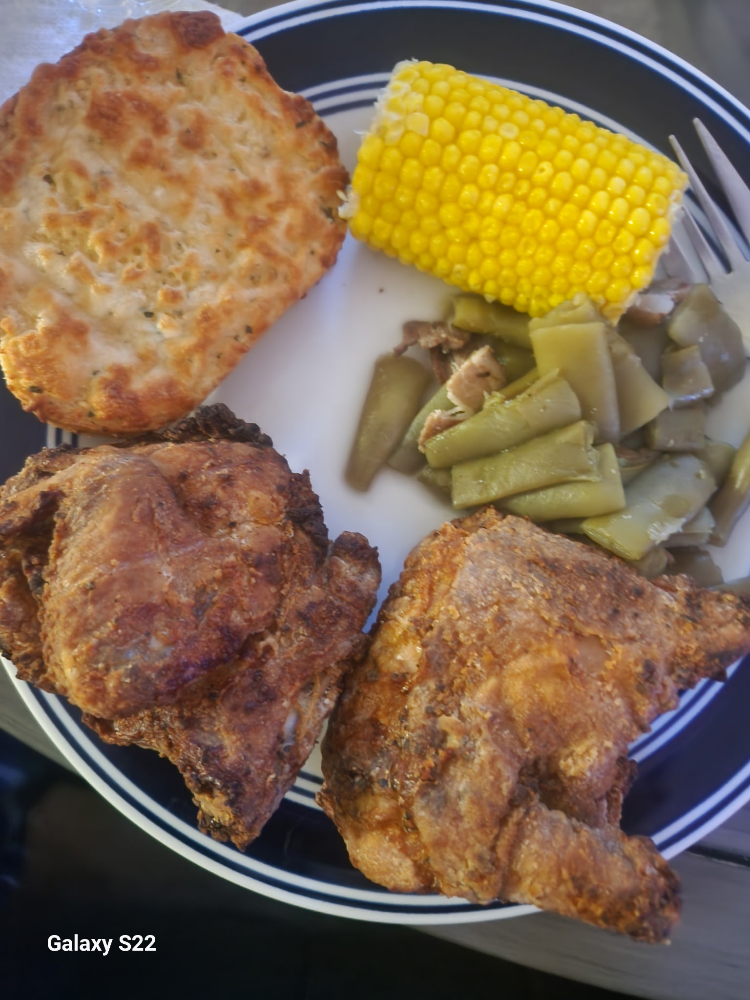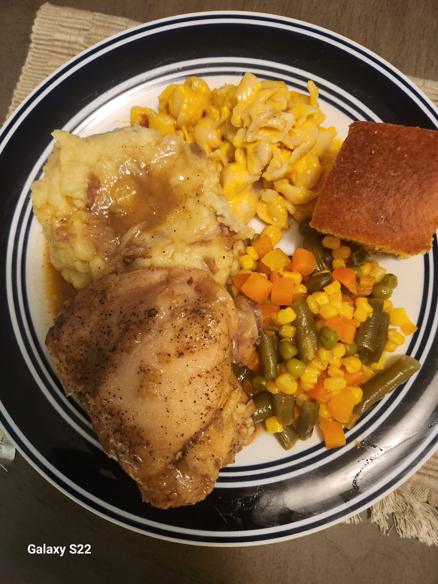 Chicken with Mashed Potatoes, Mac and Cheese, Cornbread, and Mixed Veggies